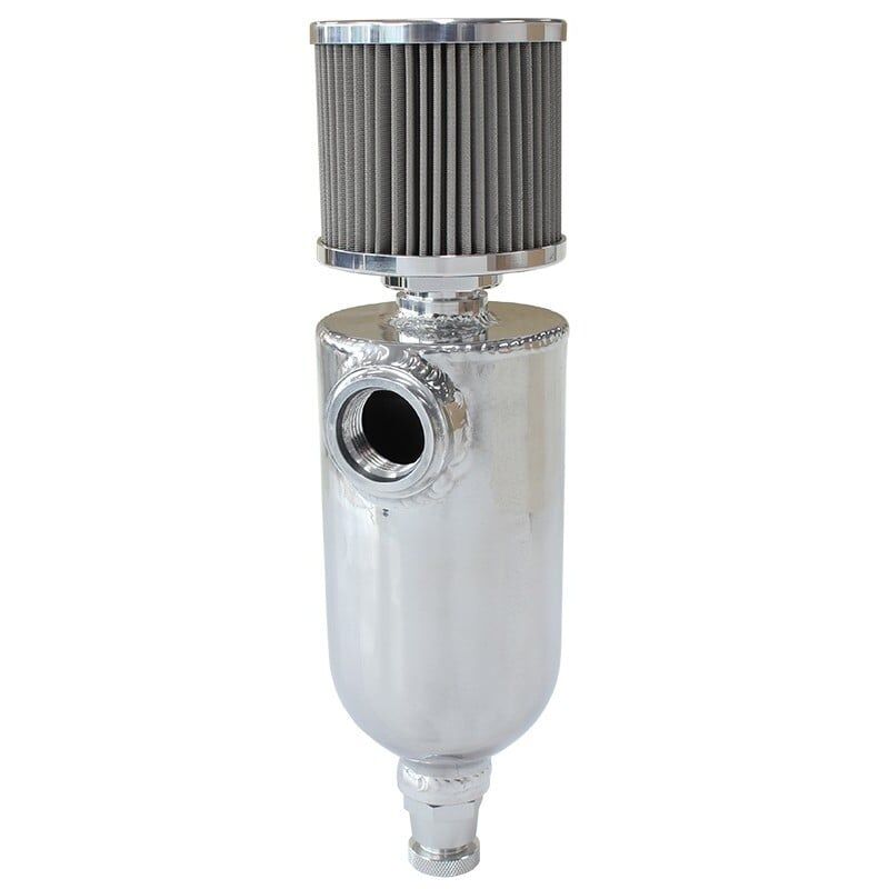 This Aeroflow Performance universal breather tank is an essential step in removing PCV oil before it enters the combustion chamber. This is used on the fresh air side of an engine breather system and is open to the atmosphere or plumbed back into the system after the MAF sensor on EFI equipped engines.