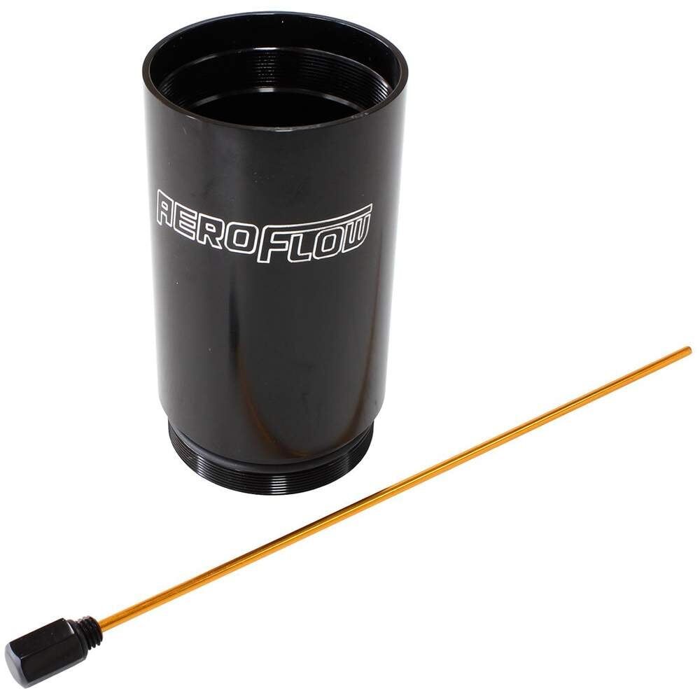 The Aeroflow Performance billet universal catch can extension has been designed to work with our smaller universal catch cans (AF64-4363 or AF64-4364). This will allow you to unscrew the catch can and insert this larger extension piece to increase the capacity from 240ml to 1000ml. This is great for charger capacity engines or turbocharged applications that require the larger volume catch can to help reduce the amount of oil vapor entering the crankcase. A new long billet dipstick is included to accommodate the longer depth.