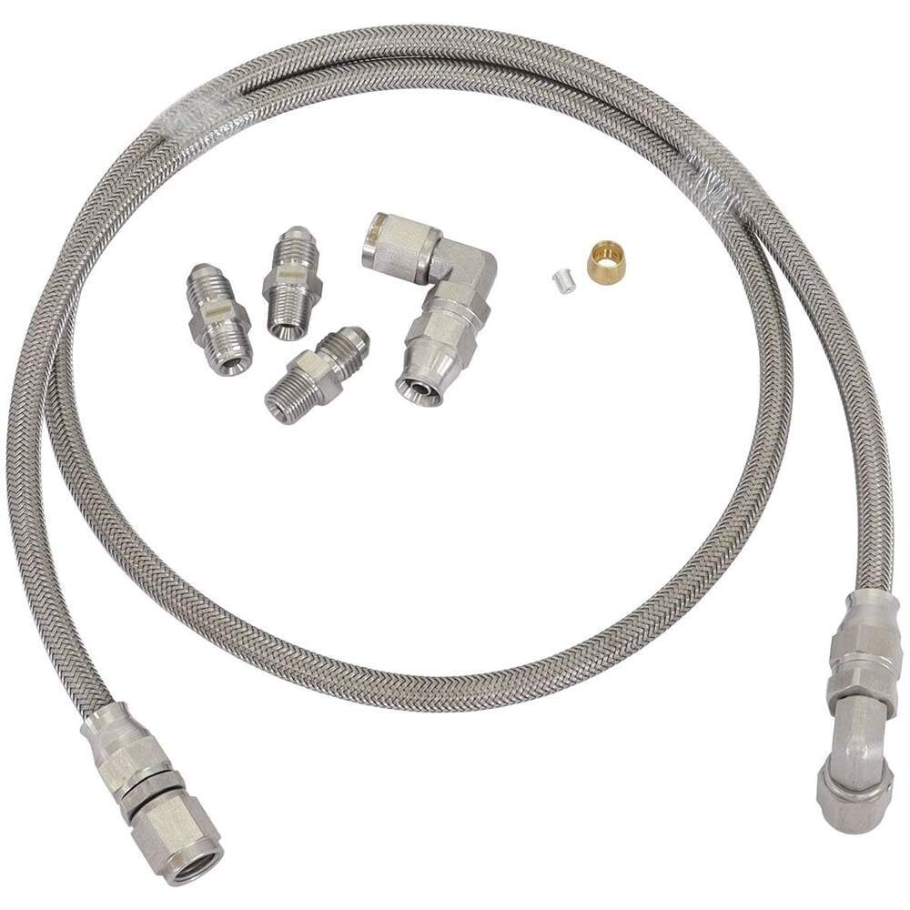 This universal turbo oil feed line kit is perfect for those wishing to upgrade a factory turbo oil feed line. The one meter long -4AN 200 series PTFE braided hose comes with the 90-degree and straight 304 stainless steel fittings pre-installed onto the braided line. As well as a spare 90 degree -4AN 304 stainless steel fitting if you wish to cut down the line or change the angle of the braided hose to suit the application. Included in the kit is a 1/8" NPT and 1/8" BSP to -4AN stainless steel adapter fittings for the engine block and turbocharger. One oil restrictor is included in the kit to restrict the amount of oil your turbocharger will see, perfect for ball bearing turbochargers.