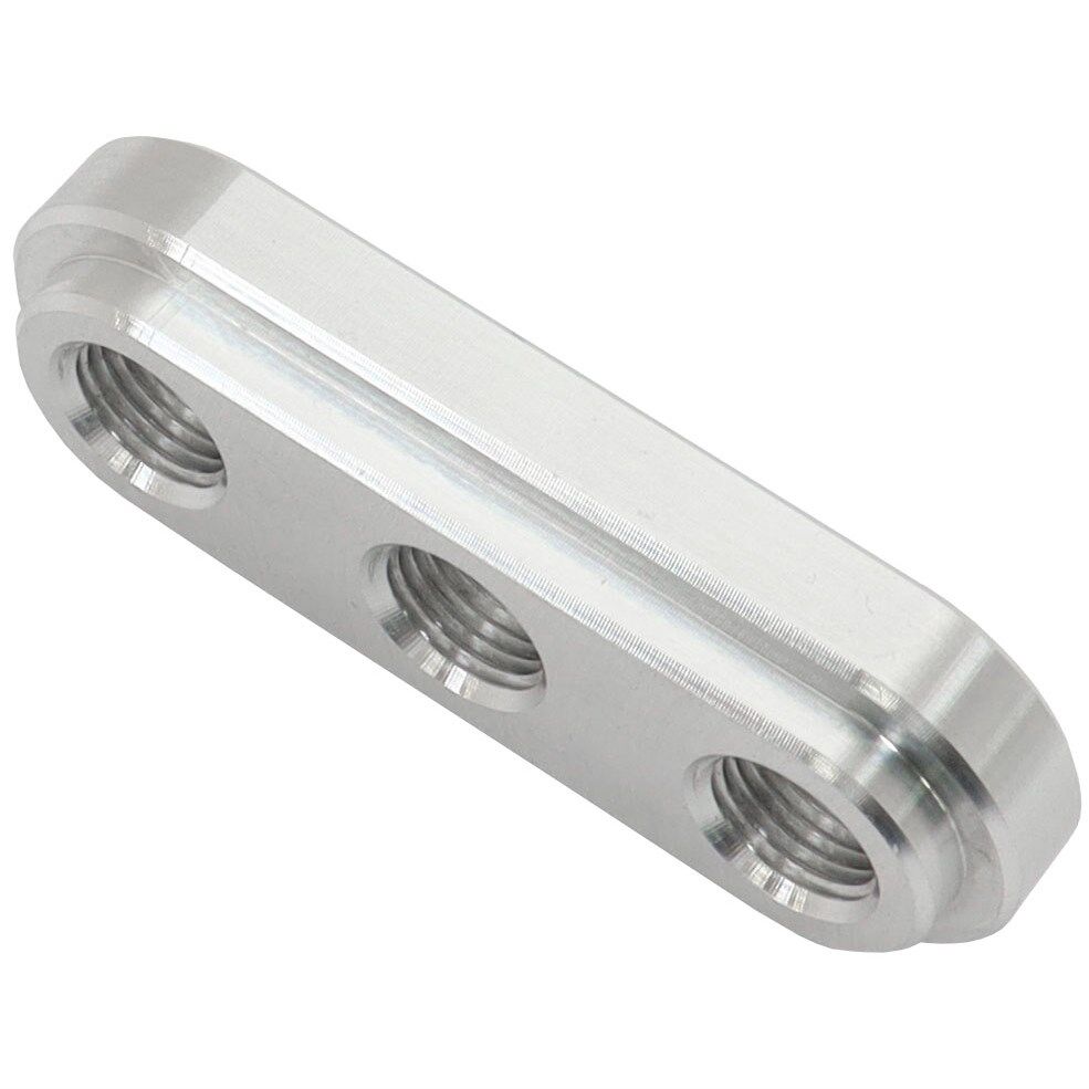 Aeroflow Performance Weld in alloy plate features 3 x 1/8" female ports. These handy plates are great for custom plumbing applications where the vehicle requires multiple sources for vacuum orbreather returns back into anyalloy pipe work. Overall length is 55mm, overall width is 20mm and overall thickness is 9mm.