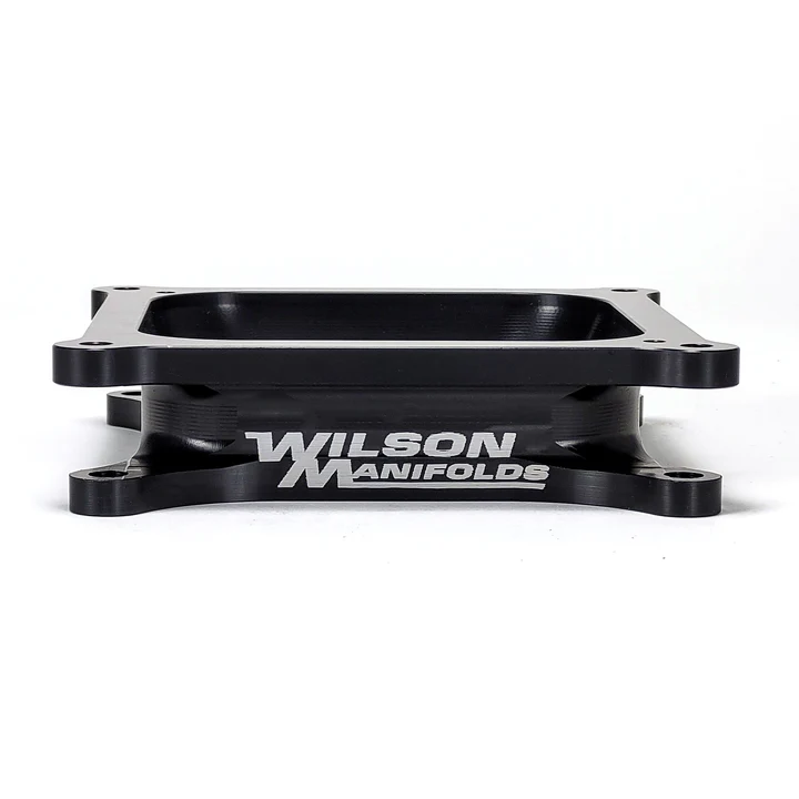 We offer the most complete line of 4-Hole Tapered spacers in 390, 4150, 4500, Q-Jet & 2bbl adapters to provide the high performance consumer with the ability to tune their engine for the maximum performance for any application. Wilson Manifolds is the only manufacturer to offer a choice of tapered spacer heights and produces the only fully CNC machined billet tapered spacer on the market. Wilson Manifolds Tapered spacers will benefit any vehicle that operates under both part and full throttle conditions such as bracket racing using a throttle stop, drag racing, circle track, road racing, off shore power boats, street/strip engines and towing vehicles.