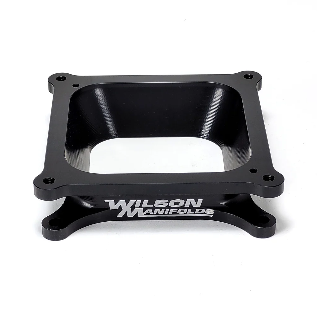 Wilson Manifolds Tapered Spacers feature a computer generated variable radius taper design that maximizes the airflow through the carburetor and enhances air/fuel distribution for more horsepower. Part throttle performance and distribution are improved by redirecting the flow pattern created by the partially open throttle blades and gradually reducing the velocity of the air/fuel mixture entering the plenum to allow for a smoother transition into each runner; full throttle performance is improved by increased flow. Our Tapered spacers can increase flow through the carburetor/throttle body by as much as 110 CFM. Wilson Manifolds tapered spacers will increase torque, horsepower and acceleration throughout the entire RPM range.