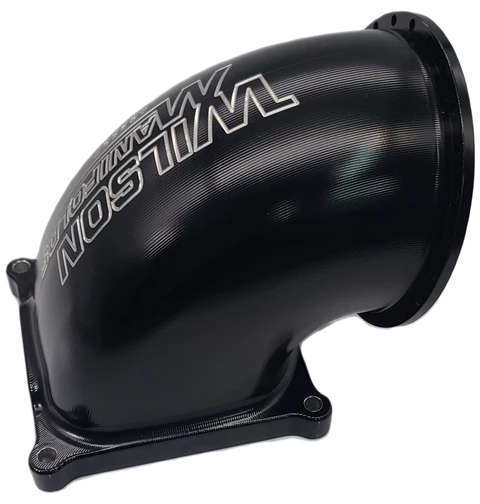 Wilson Manifolds' lightweight billet elbows provide the most efficient method of adapting their high-flow, single-bore throttle bodies to 4150 or 4500 series intake manifolds. Wilson Manifolds' elbows incorporate a computer-optimized transition from the throttle body to the intake manifold plenum for maximum airflow and distribution. Wilson Manifolds' elbows are CNC-machined to match each throttle body size.
