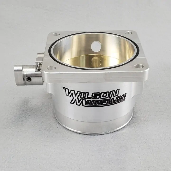 Wilson Manifolds High Flow Throttle Bodies were developed using the latest computer modeling software and test equipment available to produce designs that yield the maximum flow per square inch of cross-sectional area. This results in maximum power for any given throttle body type and size. All throttle bodies feature brass throttle blades to control vibration and reduce thermal expansion Throttle blades are fastened to the throttle shaft using aircraft quality hardware that is both Loctited and peened to assure positive retention of the blades. Throttle shafts are machined to decrease their cross-sectional area, which increases the actual cross-section available for airflow. All throttle bodies are machined from billet 6061-T6 aluminum on precision CNC machining centers for consistent quality and light weight. These high flow throttle bodies are available in sizes from 80mm, 90mm, 95mm, 105mm, and 123mm.