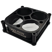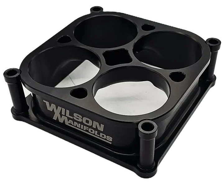 We offer the most complete line of 4-Hole Tapered spacers in 390, 4150, 4500, Q-Jet & 2bbl adapters to provide the high performance consumer with the ability to tune their engine for the maximum performance for any application. Wilson Manifolds is the only manufacturer to offer a choice of tapered spacer heights and produces the only fully CNC machined billet tapered spacer on the market. Wilson Manifolds Tapered spacers will benefit any vehicle that operates under both part and full throttle conditions such as bracket racing using a throttle stop, drag racing, circle track, road racing, off shore power boats, street/strip engines and towing vehicles.